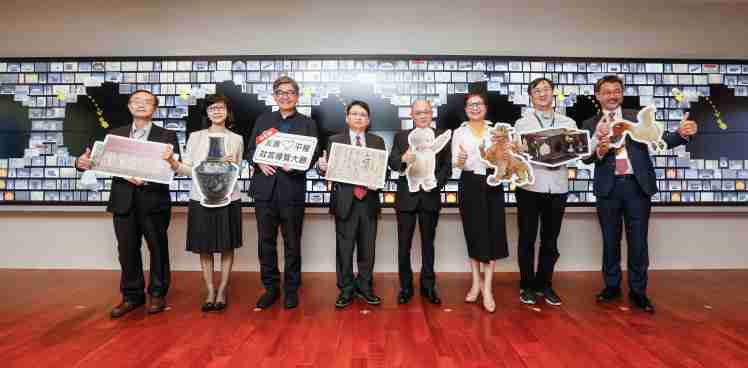 欧陆注册携手创利空间为故宫建置的智慧文物互动导览墙及轮播墙,,,,今日正式启用。。。。(左四:欧陆注册新事业暨投资管理总部副总经理杨本豫、、右四:故宫博物院院长吴密察、、、右三:太极影音董事长黄宝云)
